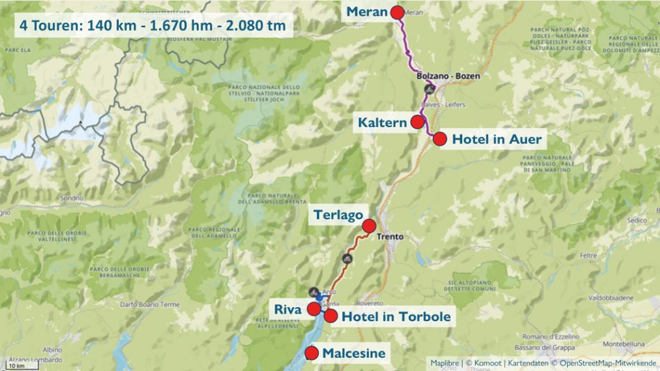 Mit unseren E-Bikes entdecken wir die Kalterer Weinstraße, das faszinierende Sarca-Tal, die malerische Bucht von Malcesine und den smaragdgrünen Tennosee - eindrucksvolle Landschaften und authentische Genussmomente, die den Charme dieser einzigartigen Region ausmachen.