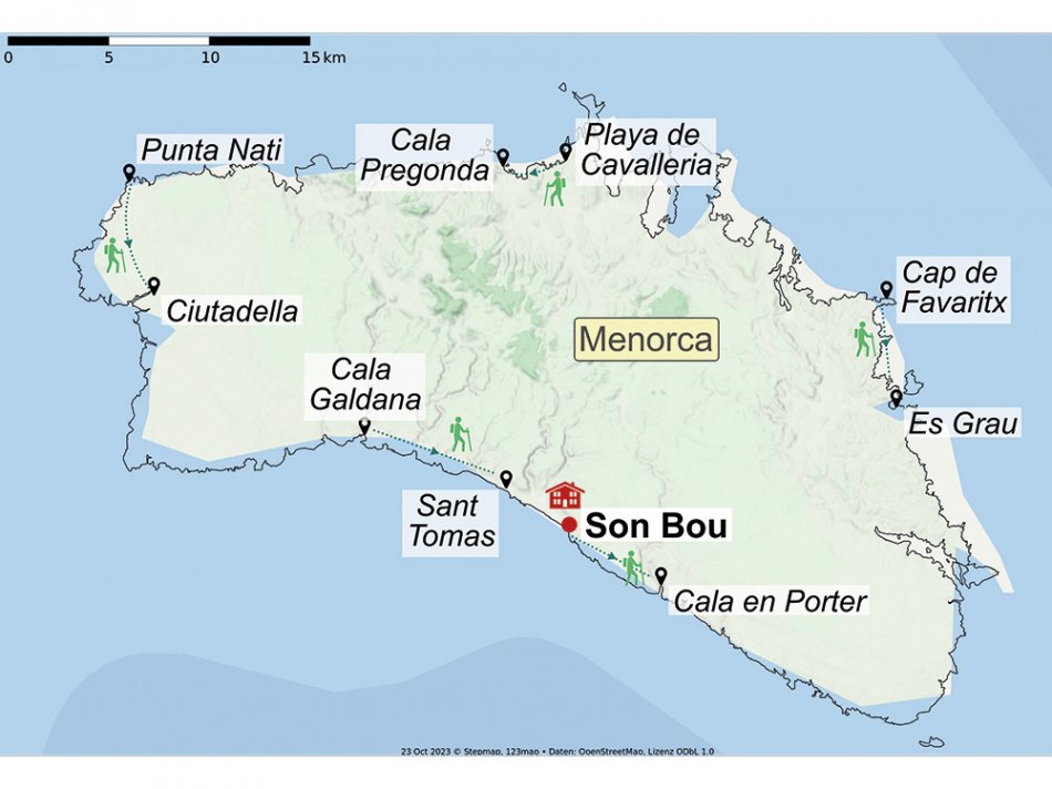 - Wanderung Son Bou - Cala en Porter: Von der Felsküste über eine kleine Schlucht und der Cala de llucalari vorbei an Weiden erreichen Sie die Anhöhe mit einmaliger Aussicht und mit der teilweise ausgegrabenen Fundstätte des talayotischen Dorfs Torre dén Galmes. Die Strecke geht weiter durch blühende Landschaften mit Obstplantagen im Hinterland und führt zurück zur Küste, zur schönen Bucht in Cala en Porter. Gehzeit ca. 4 Std., 190 m Anstieg, 255 m Abstieg, ganztags